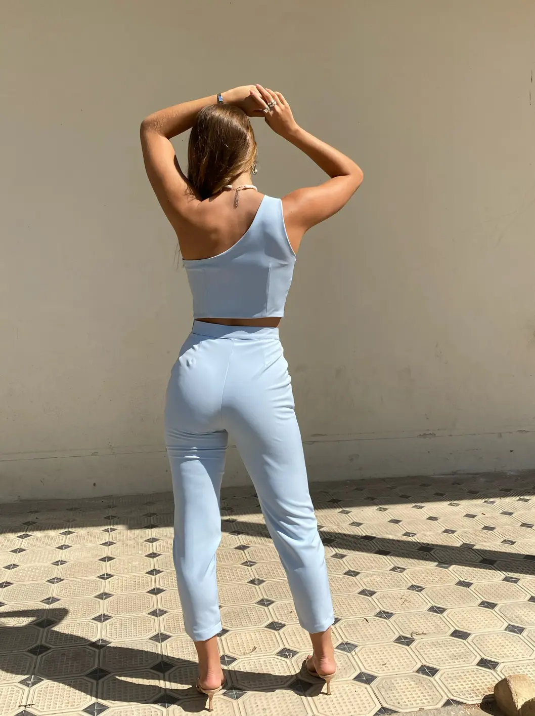 חליפת מיוחדת ומחמיאה טוף אה סימטרי שנסגר ברוכסן צד ושתי רצועות שנקשרות למראה הדוק ומיוחד . מכנסיים גבוהים וצרים עם כיסים רוכסן וכפתור .